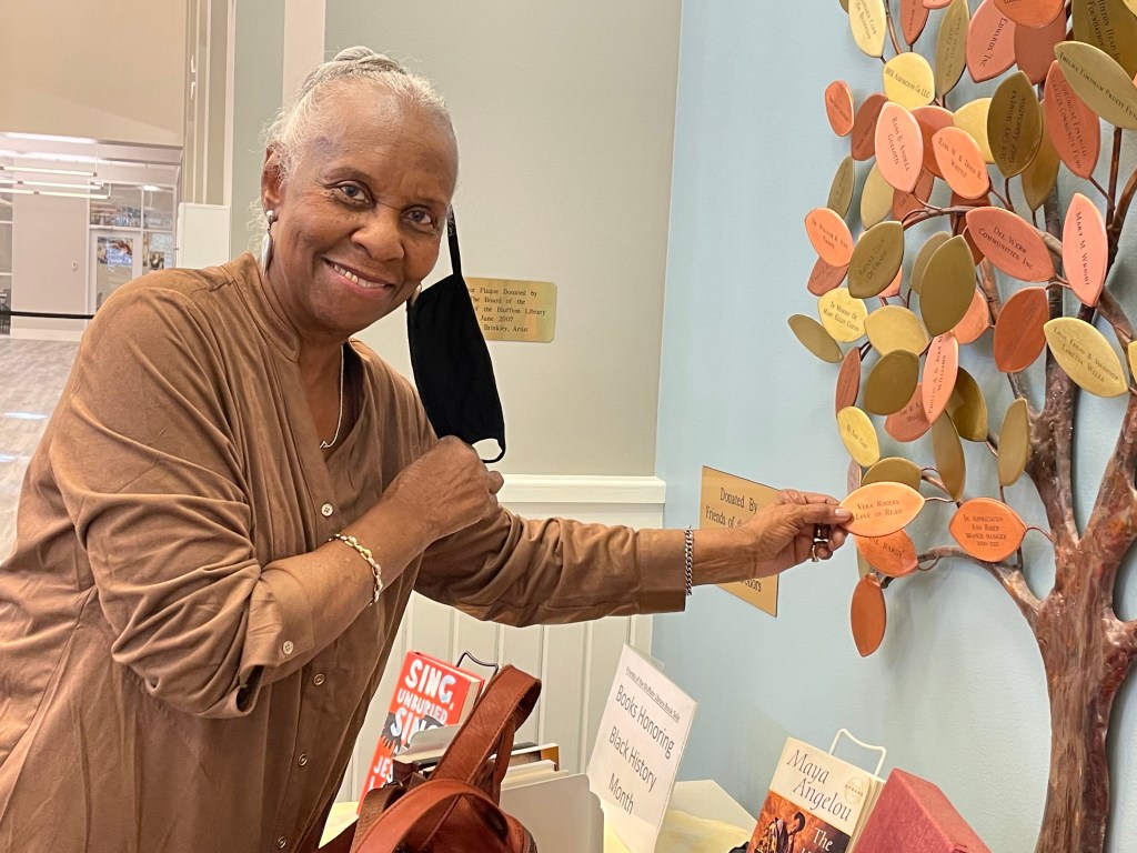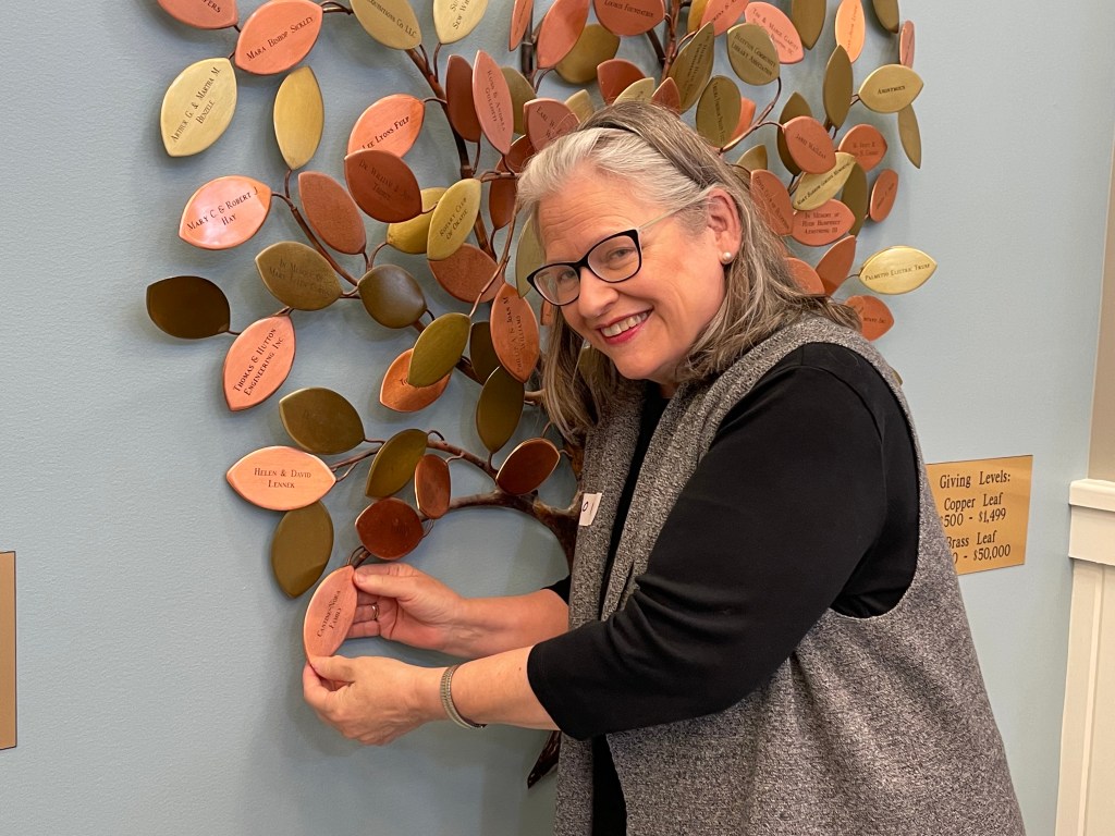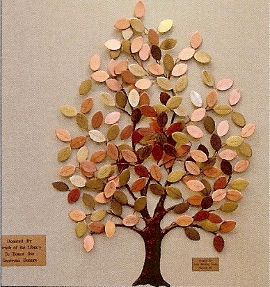 The Friends of the Bluffton Library Giving Tree was created to honor those donating to the original building campaign in November 2002. Brass and copper leaves are inscribed with the names of individual and corporate donors.