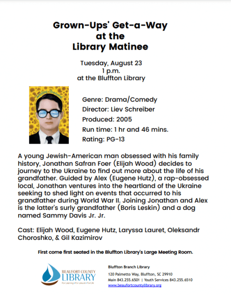 - Grown-Ups’ Getaway at the Library Matinee at Bluffton, 1pm [see above]