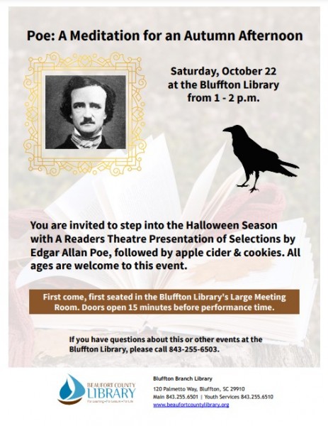 - A Readers Theatre Presentation of Meditations for an Autumn Afternoon: Selections from Edgar Allan Poe at Bluffton, 1pm