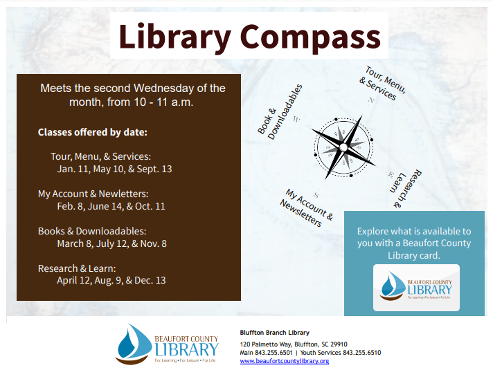 - Library Compass: Tour, Menu, & Services at Bluffton, 10am [see above flier for all dates]