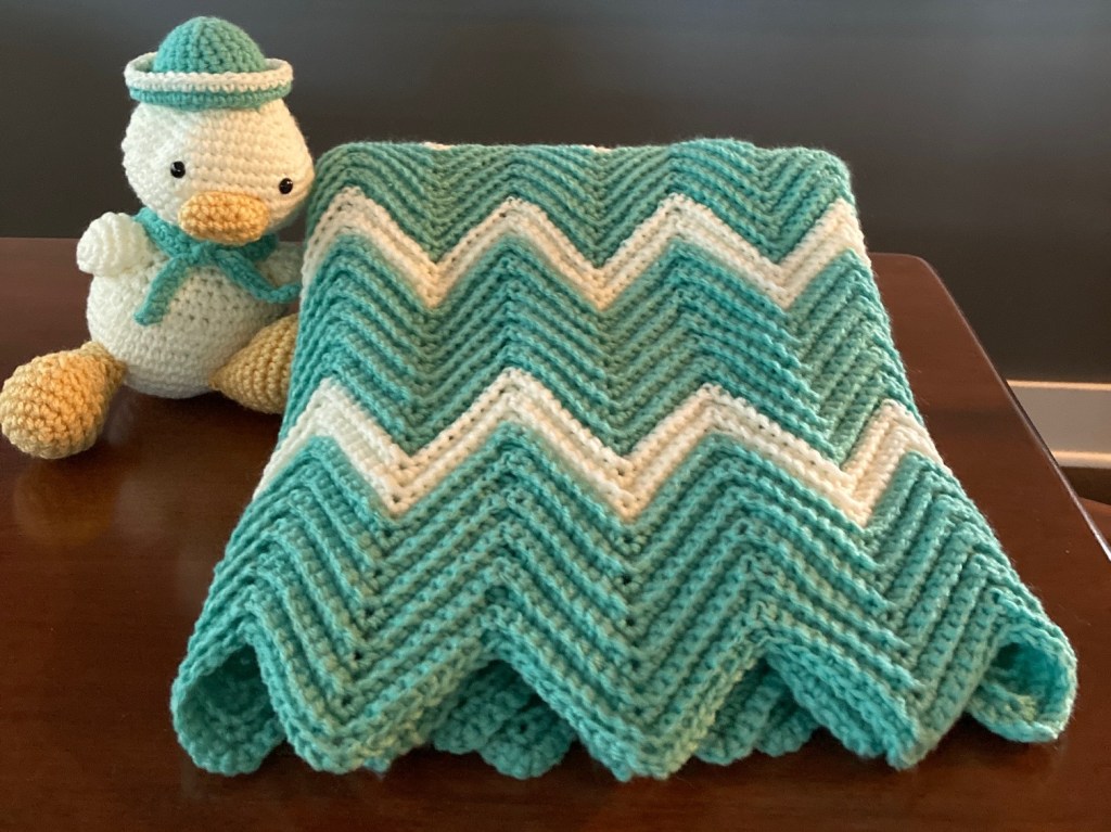 10. Gorgeous crochet baby blanket and duck. Lovingly Hand-made and donated by Diane Webster.
