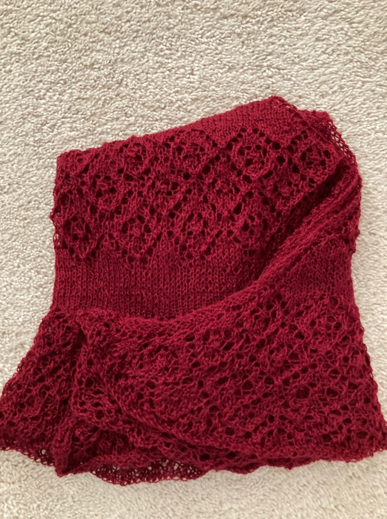 7. Delicate hand crochet cranberry shawl. Hand wash in cold water.