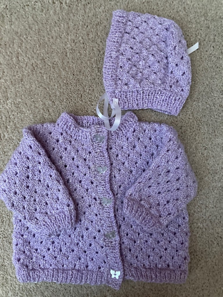 12. Beautiful Hand crochet lavender sweater with butterfly buttons and bonnet size 6-9 months. Machine wash and dry. Donated by Diane Webster.