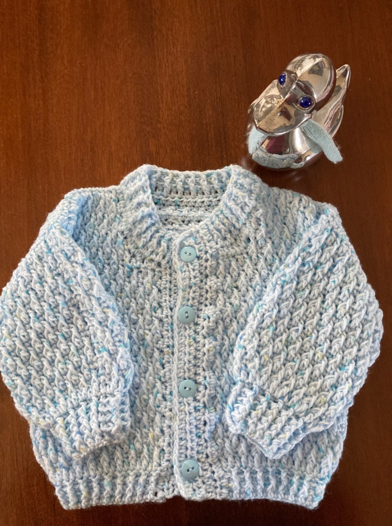 13. Adorable Blue hand crochet baby sweater, size 6-9 months and silver duck. Machine wash and dry. Donated by Diane Webster. Value $30. Starting bid $10