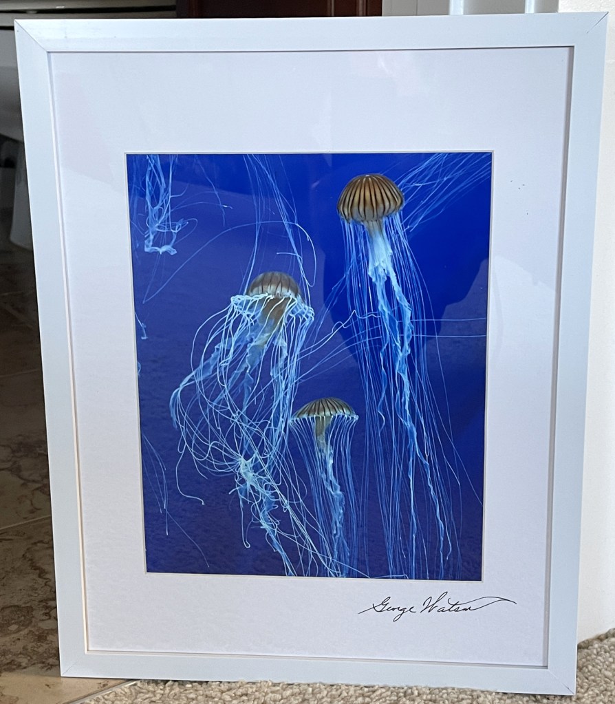 15. “Jellyfish “ Giclee print on archival paper by local artist George Watson. This 12” x 15” print is signed, matted and framed. Value $95. Starting bid $25.