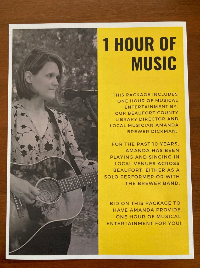 16. Enjoy one hour of fabulous entertainment by our own very talented Amanda Dickman, Beaufort County Library Director! She has been singing and playing the guitar in local venues across Beaufort for the past 10 years.