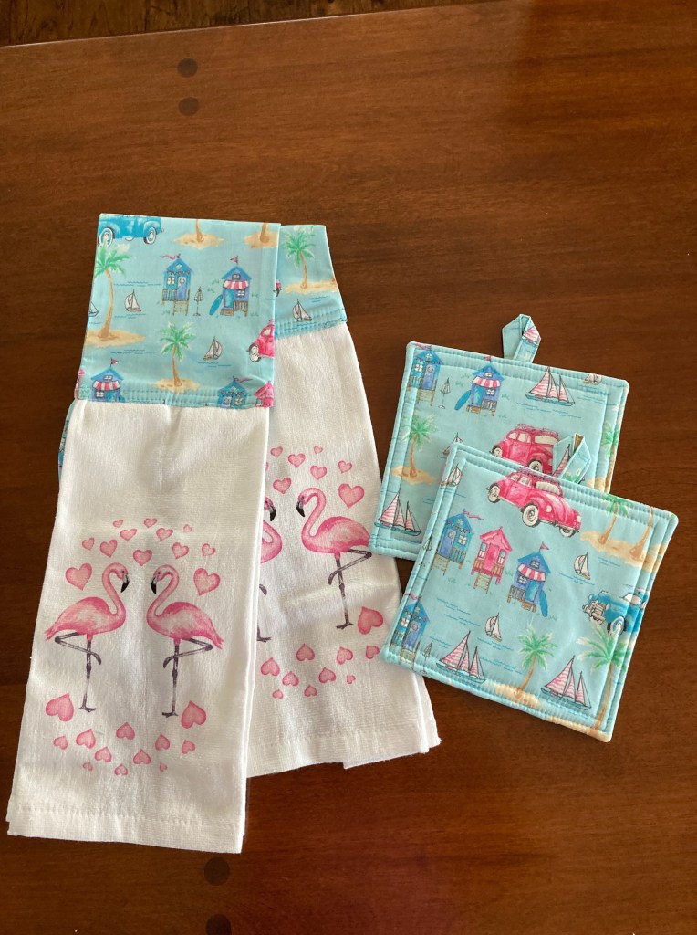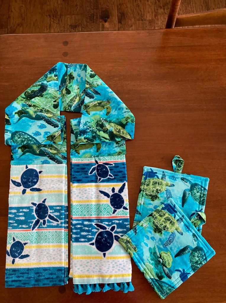 17. Kitchen Boa and Pot holders. Beautifully handmade and generously donated by a Bluffton Friend of the Library. Wear it like a shawl when busy in the kitchen. You can dry your hands on it and never have to look for a dish towel again. Comes with 2 potholders as well. Great hostess gift. Value $30 each. Starting bid $10 each