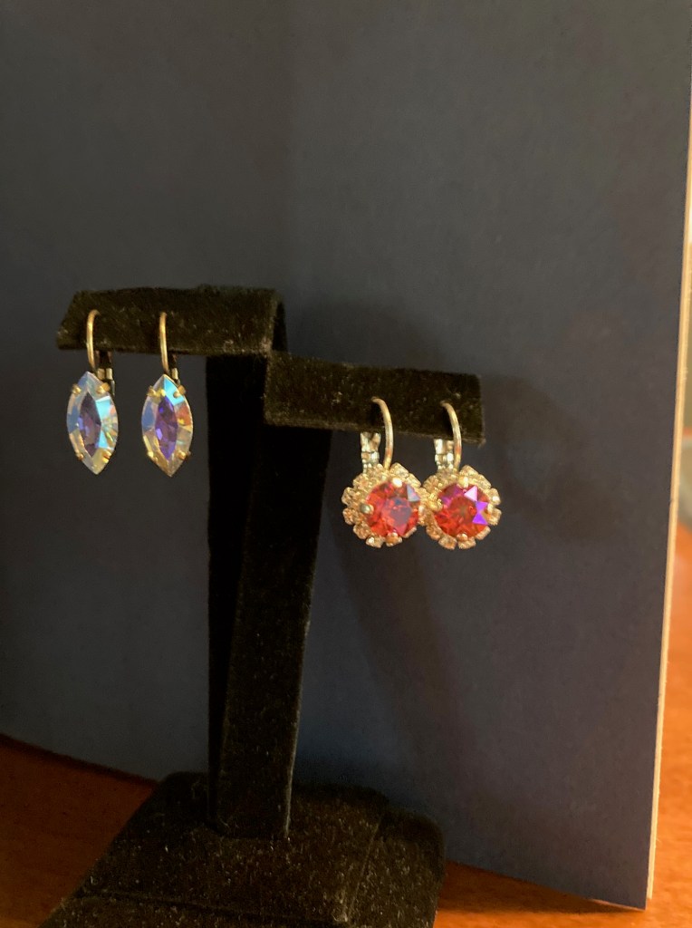 18. Sparking Swarovski crystal earrings exquisitely designed by local artist Sana DiTomasso. Diamond shaped earrings Value $25. Starting bid $10 Round pink earrings Value $30 Starting bid $10