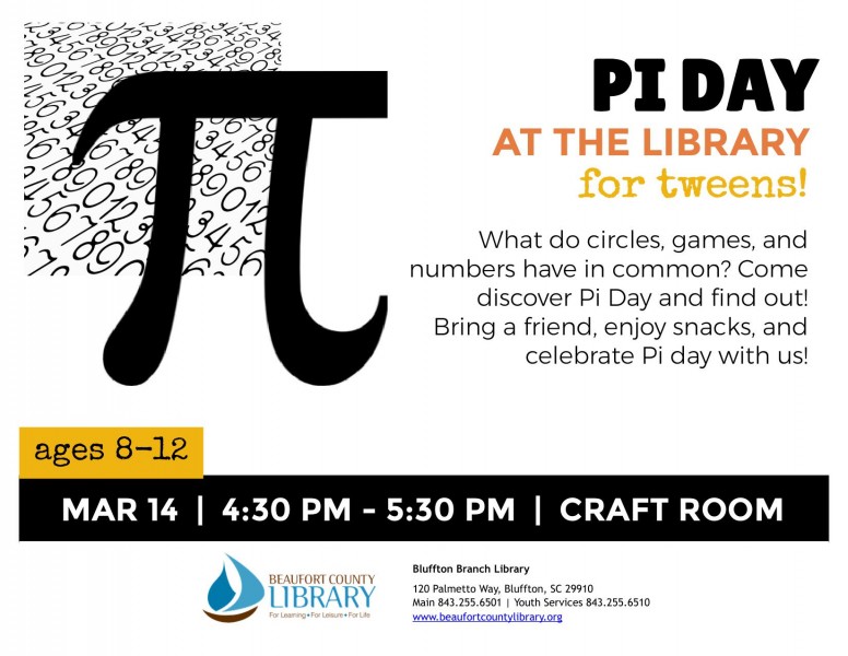 - Pi Day for Tweens at Bluffton, 4:30pm [see below]