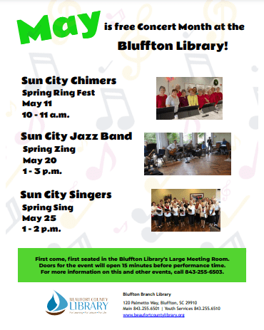 - Spring Ring Fest – Performance by the Sun City Chimers at Bluffton, 10am [see flier above]