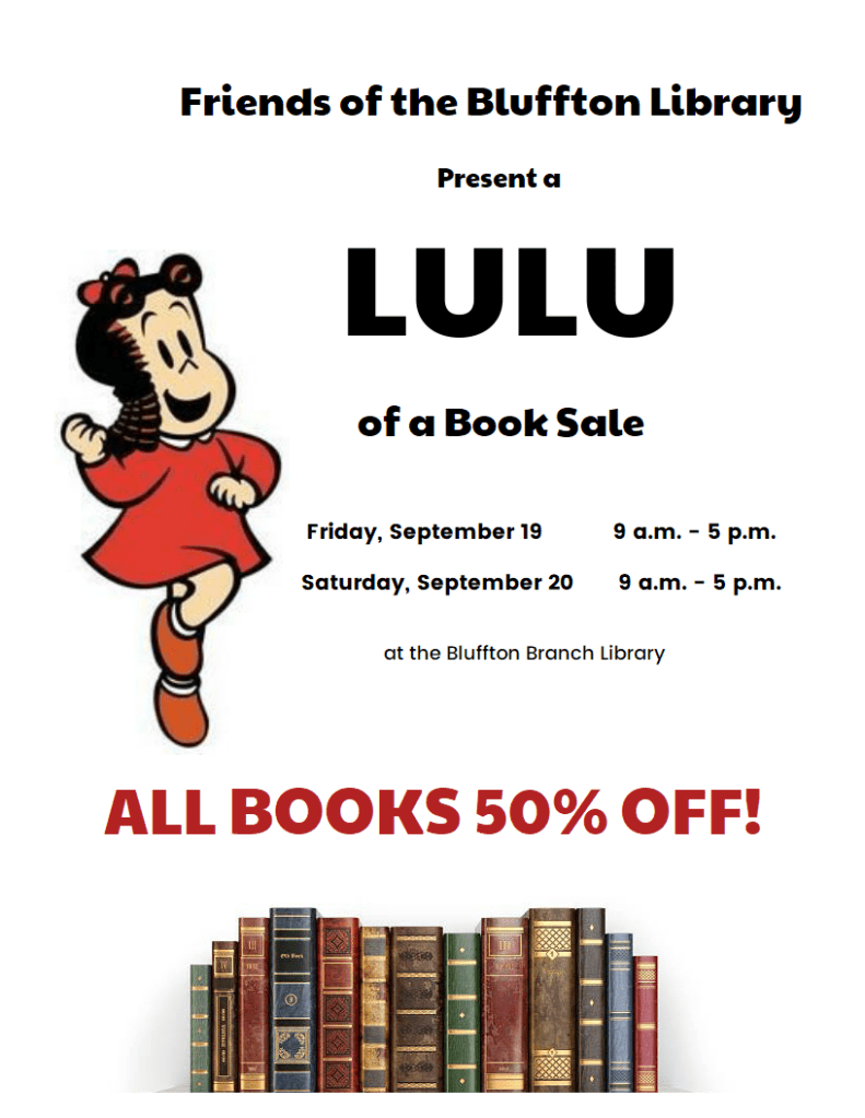 Fall Book Sale at the Bluffton Library! ~ Sept 19 & 20 August 20, 2025 / BookLady Deb Not to be missed – it’s a Lulu! See you there! c2025FriendsoftheBlufftonLibrary Share this: Click to share on X (Opens in new window) X Click to share on Facebook (Opens in new window) Facebook Like Loading... Related