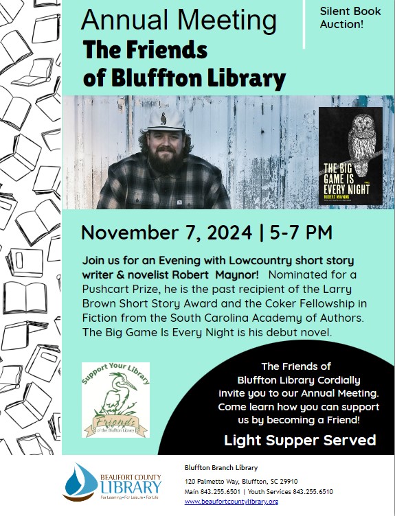************A Light Supper will be served! There will be a Silent Auction of several collectible books! More information on our Visiting Author Robert Maynor here: https://www.robertmaynor.com/ Hope you can join us!! c2024 FriendsoftheBlufftonLibrary